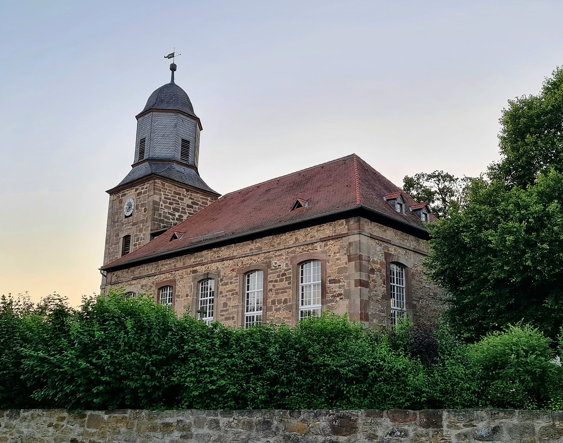 Die Dorfkirche steht zentral im historischen Ortskern und ist ein Bau aus dem Jahr 1799 mit Natursteinmauerwerk und einem kleinen Glockenturm.